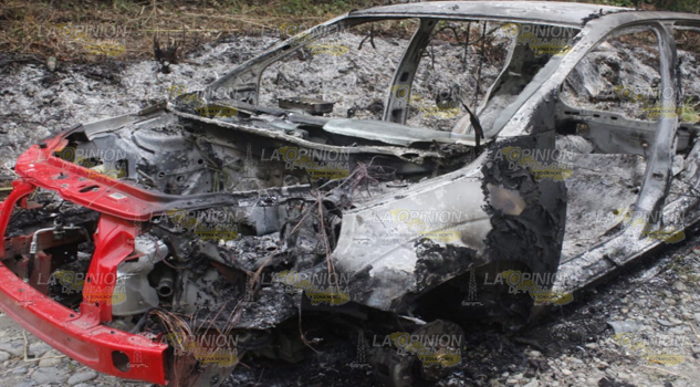 Poza Rica, Ver.- Completamente reducido a cenizas quedó un auto compacto, al parecer se trata de un taxi, en un camino de terracería que conduce al relleno sanitario.