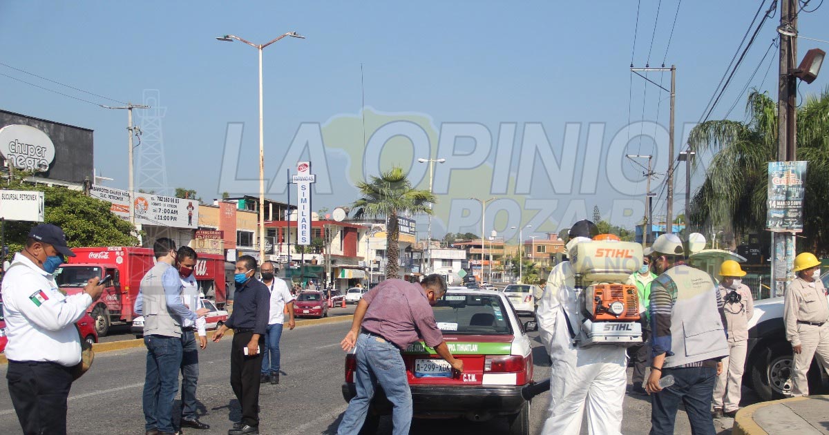 Personal de la Secretaria de Seguridad Pública, autoridades municipales, Protección Civil, así como Transporte Público, así como de Bartolo Avendaño Borromeo director de Protección Contra Riesgos Sanitarios en el Estado, acudieron al operativo sanitario para entregar de manera masiva gel antibacterial y exhortar a la ciudadanía para usar de manera permanente el cubrebocas.