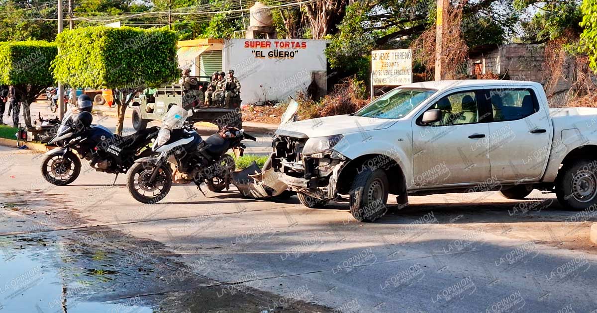 Álamo, Ver.- Un elemento de la policía estatal motorizado resultó lesionado luego de impactar contra la parte frontal de una camioneta Nissan color blanco, sin placas de circulación, propiedad de una empresa dedicada al procesamiento de cítricos.