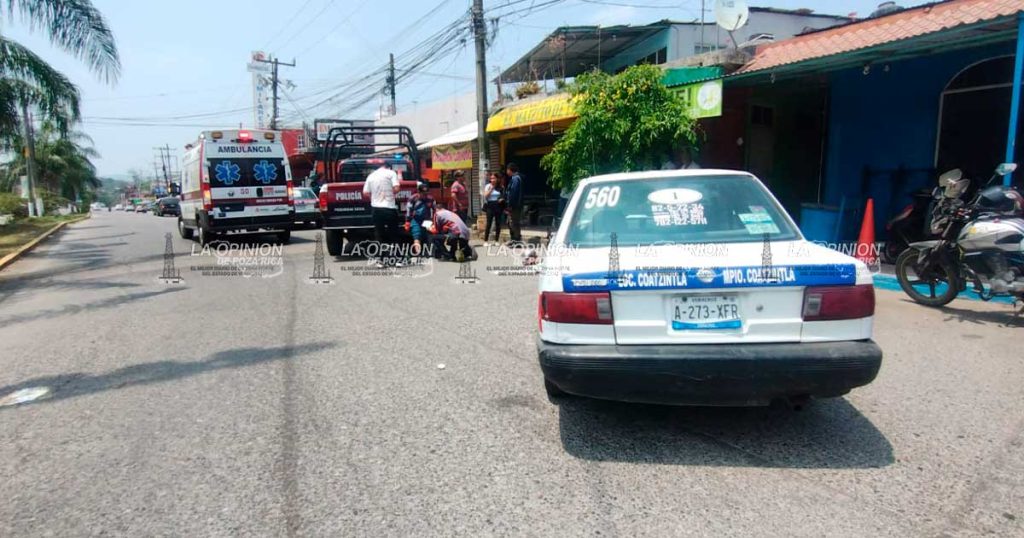 Poza Rica, Ver.- La tarde de este sábado, un accidente vehicular se registró en el fraccionamiento Kawatzin, cuando un taxi con número económico 560 del municipio de Coatzintla derribó a un vendedor de tortillas, dejándolo tendido sobre el asfalto.