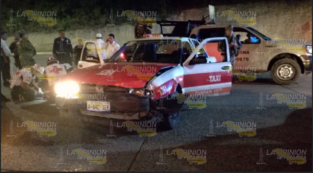 Tuxpan.- Taxista que manejaba a exceso de velocidad terminó estrellado en un coche particular dejando como saldo una persona lesionada y daños materiales de consideración, las unidades involucradas quedaron a disposición de las autoridades de vialidad.
