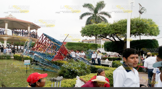 NARANJOS, VER.- La estructura de un “castillo” se derrumbó en el parque Constitución, frente al edificio del ayuntamiento, donde la…