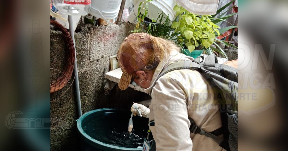 Coatzintla, Ver. – Personal de Vectores de la Jurisdicción Sanitaria N. 3 de Poza Rica, realiza una jornada preventiva contra el dengue, aplicando polvo abate en los contenedores de agua en viviendas del Infonavit Kawatzin, donde, además, dialogan con los jefes y jefas de familia, para mantener sus patios limpios de maleza, basura y cacharros.