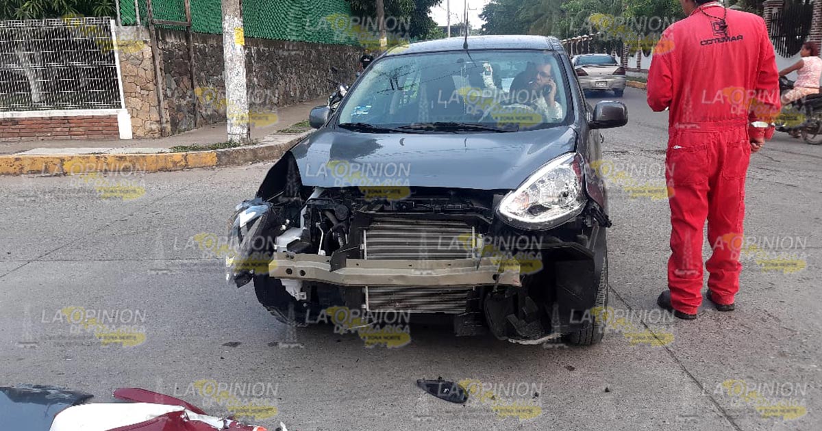 Tuxpan, Ver.- Conductor de un automóvil que no hizo alto total en un peligroso cruce, de esta ciudad provocó un aparatoso choque el cual arrojó elevados daños materiales y una persona lesionada.