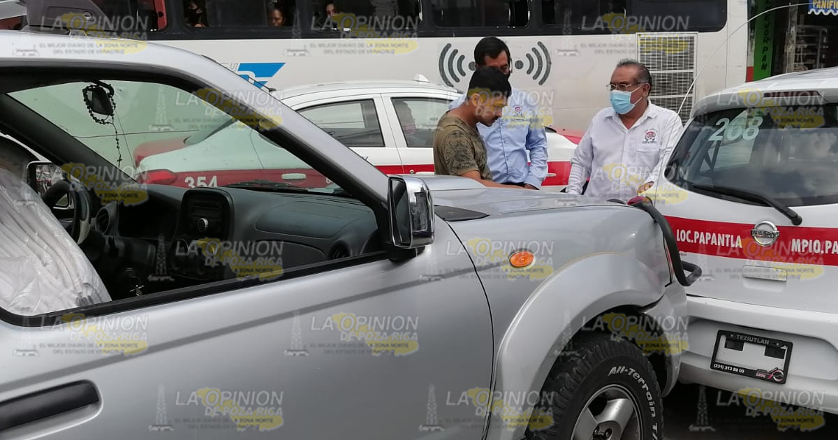 Papantla, Ver.- Pequeño accidente se registró la tarde de este martes cuando el conductor de una camioneta no hizo alto y chocó por alcance contra una unidad de alquiler, no hubo personas lesionadas y solo se registraron daños materiales.