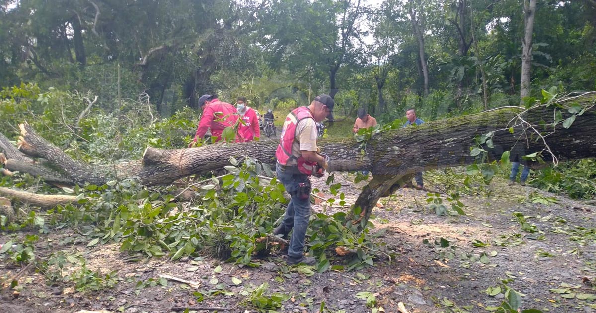 Después de más de 8 horas de estar bloqueado el paso hacia dos comunidades, el personal de los grupos de emergencia pudieron retirar los troncos y ramas de un árbol de palo de rosa de aproximadamente 30 metros el cual había quedado obstruyendo la vialidad sobre esta importante vía de comunicación.
