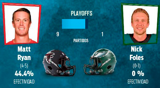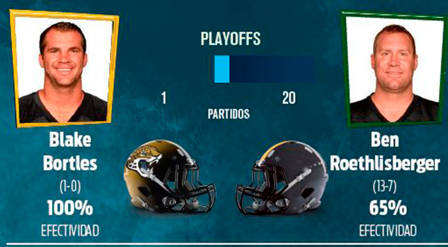 En el compromiso de los Jaguars frente a Steelers sucederá algo similar; Blake Bortles sólo ha iniciado un partido en esta fase, mientras que Ben Roehtlisberger lleva 20. El duelo entre pasadores que podría considerarse más parejo sería el que ocurrirá entre Falcons y Filadelfia, ya que Matt Ryan ha tenido nueve inicios en Playoffs, cuando Nick Foles sólo lleva uno.