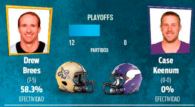 El único quarterback con menos experiencia que entrará al emparrillado con su equipo como favorito es el de los Vikings, Case Keenum, quien curiosamente es el único de los ocho mariscales de campo que lideran a los equipos que se encuentran en Ronda Divisional y que nunca ha disputado un juego de Postemporada, por lo que tendrá la responsabilidad de hacer válidos los pronósticos contra uno de los QB más experimentados de la NFL: Drew Brees, quien ha disputado 12 juegos de eliminación directa.
