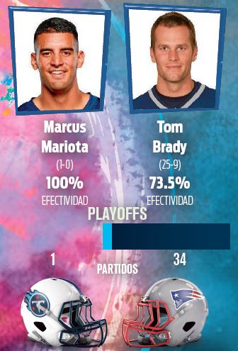 La diferencia más abismal de los choques entre mariscales de campo se dará en el duelo entre los Titans y los Patriots, pues mientras Tom Brady acumula 34 juegos de Postemporada, su rival, Marcus Mariota, sólo tiene una aparición.