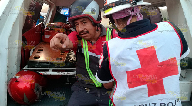 Fue en este sitio donde los obreros Emilio Amador Hernández de 37 años y con domicilio en la congregación de Santiago de la Peña de este puerto e Israel Arellano Lucas de 40 años, vecino de la colonia Pisa Flores, resultaron lastimados al estrellar la moto en la que viajaban contra el costado izquierdo de un coche de alquiler.