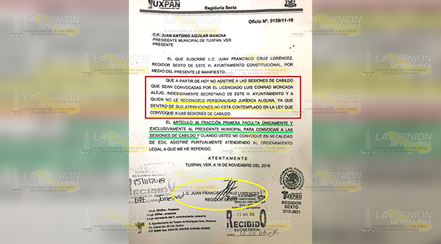 Luego de ser convocado a la sesión de cabildo, del 20 de noviembre, el regidor Cruz Lorencez respondió mediante oficio Nº 0138/11-18, que “a partir de hoy”, no asistirá a las sesiones de cabildo convocadas por el secretario del ayuntamiento, Luis Conrad Moncada, porque no le reconoce personalidad jurídica.
