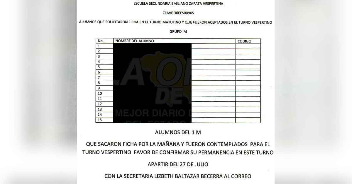 De acuerdo a quejas que han llegado a este medio de comunicación, y a otras que han hecho saber en la página oficial, de esta escuela, que se encuentra en Facebook, los padres de familia mencionaron que el jueves se dio a conocer una lista de treinta alumnos del grupo “A” al “G”, donde se suponía que todos los alumnos habían quedado en el turno de la mañana.