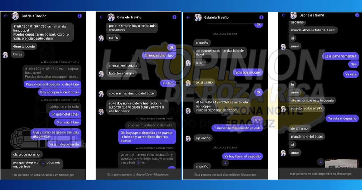Sin embargo, Gabriela le pidió a su cliente que antes del encuentro debía realizar un depósito de 600 pesos lo equivalente a dos horas y el resto, se lo entregaría en el hotel.