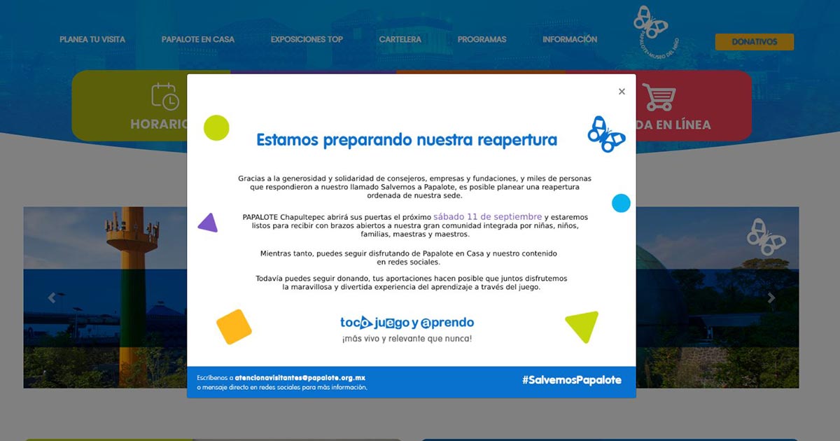 En la página Web del Museo se despliega un mensaje en el que agradece la generosidad y solidaridad de consejeros, empresas, fundaciones y miles de personas que respondieron al llamado para salvar al Papalote.