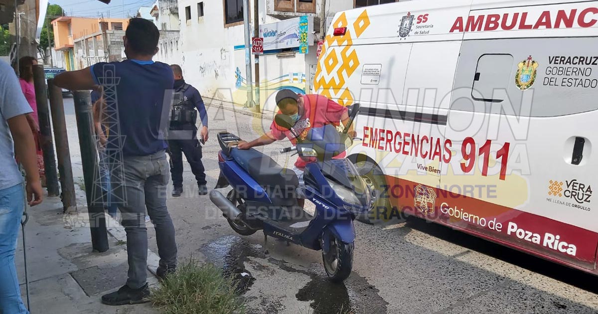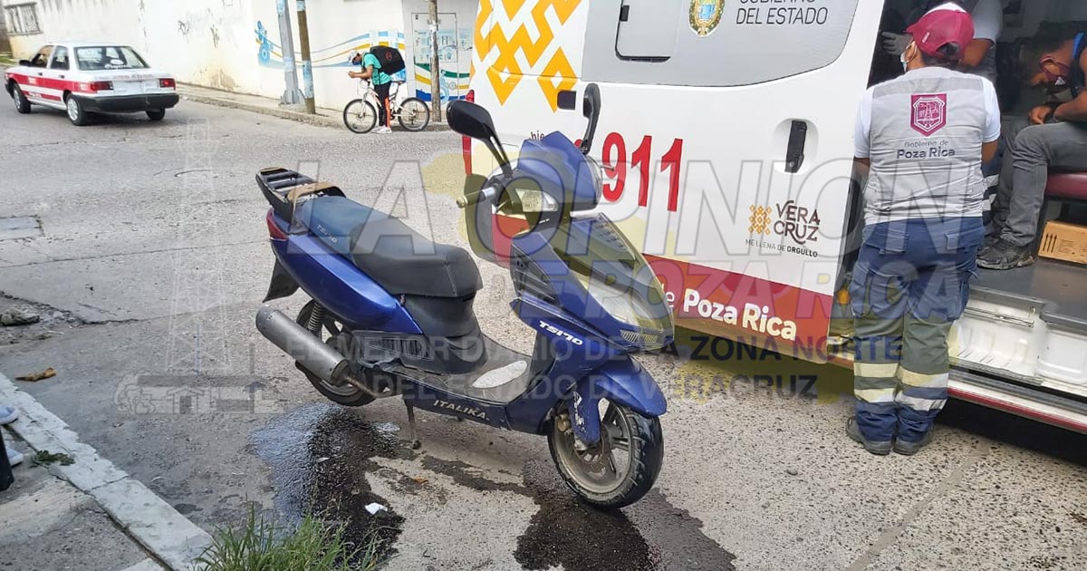 Poza Rica, Ver.- Dos jóvenes recibieron los primeros auxilios en la colonia Arroyo del Maíz tras derrapar la motoneta que manejaban afortunadamente no sufrieron heridas de gravedad.