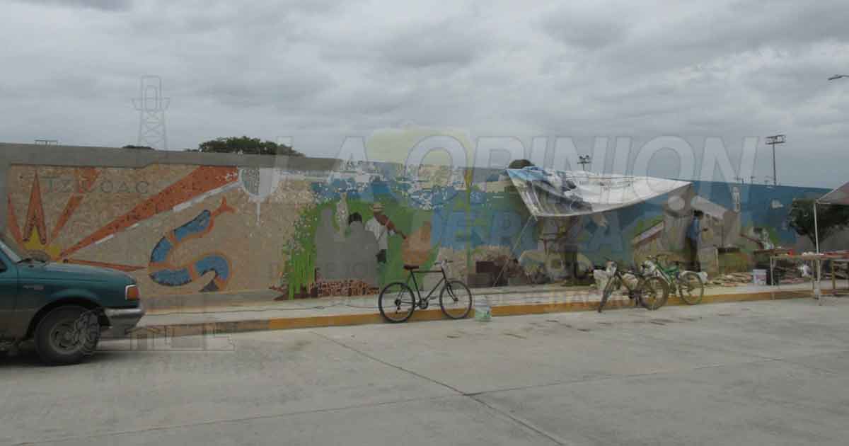 Álamo, Ver.- Con la colaboración de artistas locales que suman su talento y paciencia para esta magna obra cultural, el vitro mural que se elabora sobre la barda perimetral del campo deportivo “José Chao” cobra vida poco a poco, y a un mes de haberse plasmado sus primeros trazos los trabajos presentan ya un avance del diez por ciento.