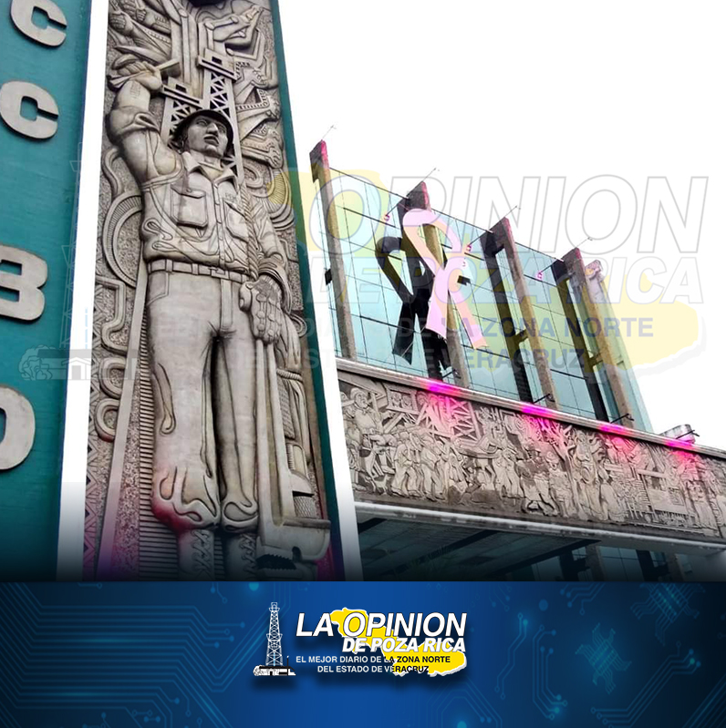 El sindicato de trabajadores petroleros de la sección número 30, se une a la lucha contra el cáncer de mamá, vistiendo de rosa el emblemático edificio sindical