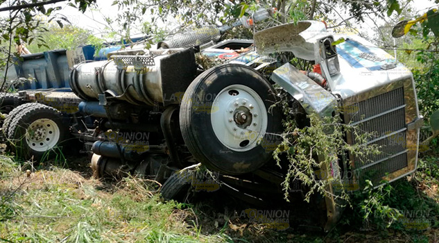 Tuxpan, Ver.- El operador de un camión materialista que, tras esquivar otra pesada unidad, perdió el control y terminó volcado y estrellado en la cerca de una propiedad, por fortuna resultó ileso, esto a pesar de que el frente y la cabina del vehículo, quedó destrozada por completo.