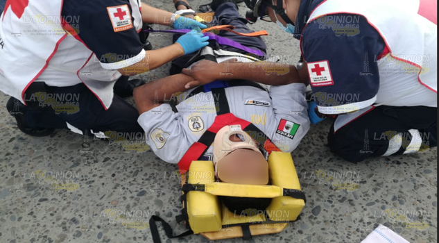 TUXPAN.- Policía del IPAX que manejaba una motocicleta y que no habría hecho alto total se impactó contra un automóvil resultando con diversas lesiones en el cuerpo por lo que tuvo que ser auxiliado por paramédicos de la Cruz Roja Mexicana y trasladado a la clínica del ISSSTE para su atención médica.