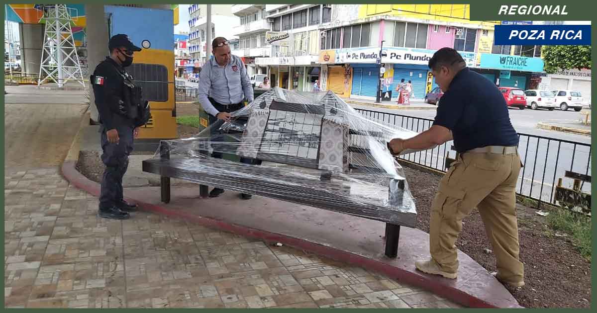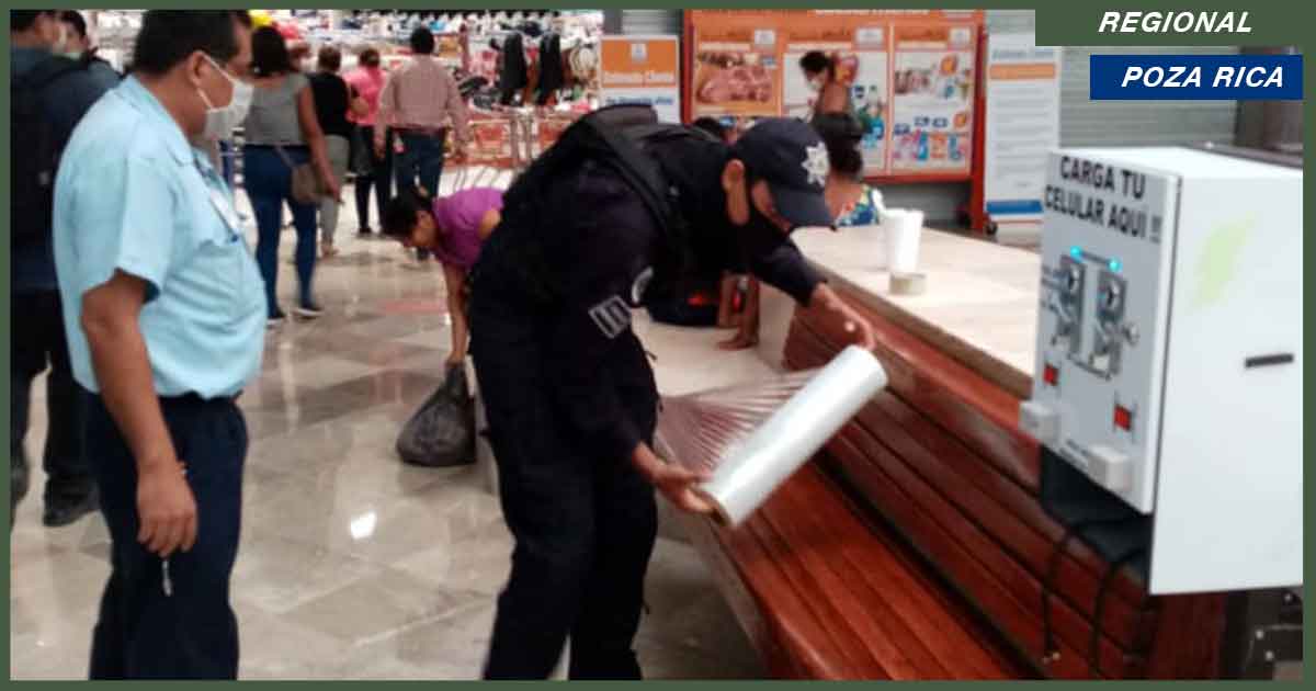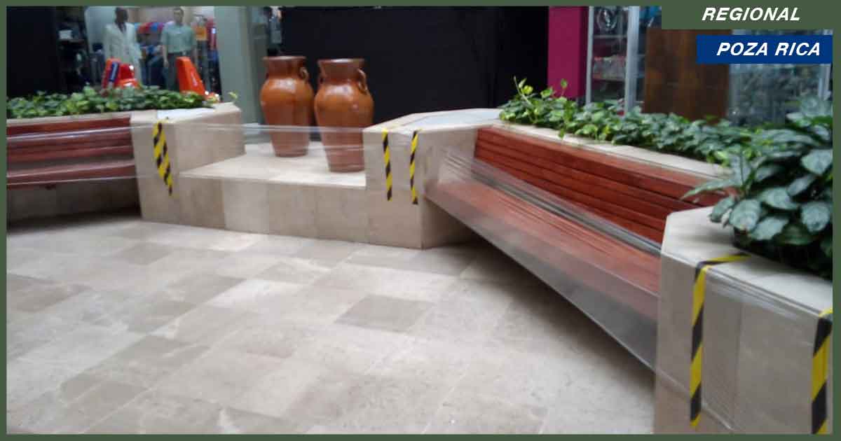 Poza Rica, Ver.- Con el fin evitar que los espacios públicos y privados de uso común, se conviertan en un punto de riesgo para la población en ésta Fase 3 de la Contingencia Sanitaria, elementos de la Policía Municipal Preventiva se dieron a la tarea de delimitar espacios en lugares públicos y plazas comerciales, a fin de que las personas no las utilicen como se venía dando de manera convencional y atiendan el llamado para evitar las posibilidades de contagio de la enfermedad del Covid-19.