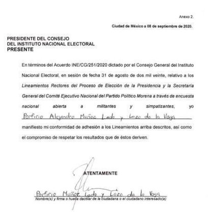 INE mostró el documento que firmaron los candidatos a la dirigencia de Morena en donde avalaron los lineamientos de la encuesta (Foto: Twitter@INEMexico)