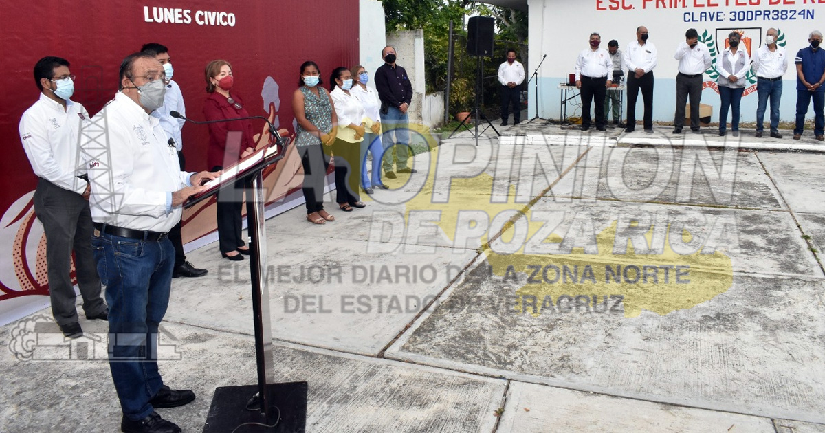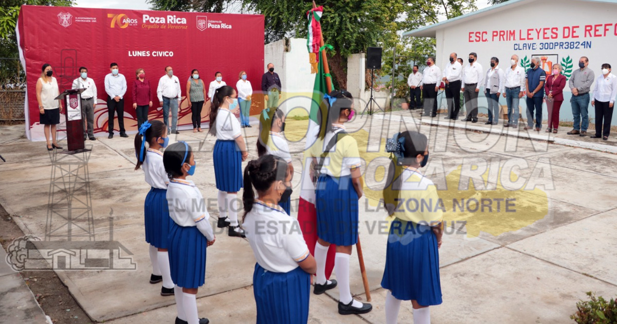 Poza Rica, Ver.- “Poza Rica de Hidalgo, es un ejemplo nacional de gobernanza; y muestra de ello son los reconocimientos que nos han otorgado gobierno y sociedad civil, por nuestras buenas prácticas de gobierno abierto”, expresó el alcalde Francisco Javier Velázquez Vallejo, al encabezar la mañana de éste lunes los honores a los símbolos nacionales, en el marco del Programa Cívico Escolar, desarrollado en esta ocasión, por la presente administración municipal, en la escuela Primaria Leyes de Reforma, ubicado en la colonia Reforma.