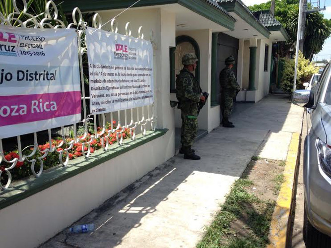 Poza Rica, Ver.- Fuerzas castrenses resguardan oficinas del OPLE en el V distrito, además de elementos de Fuerza Civil con…