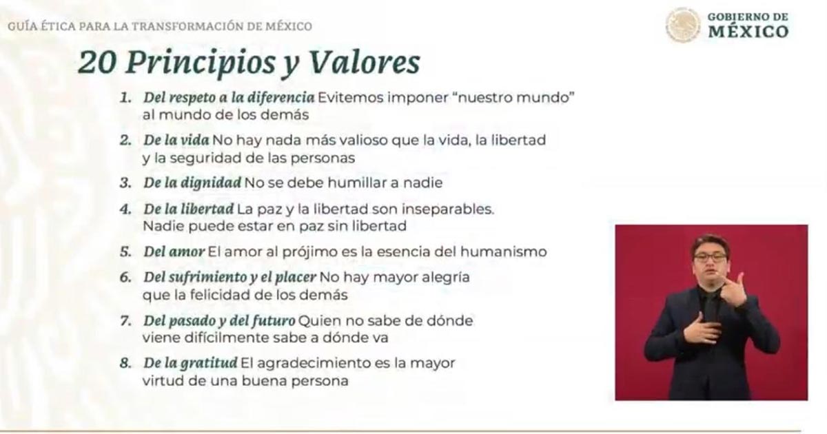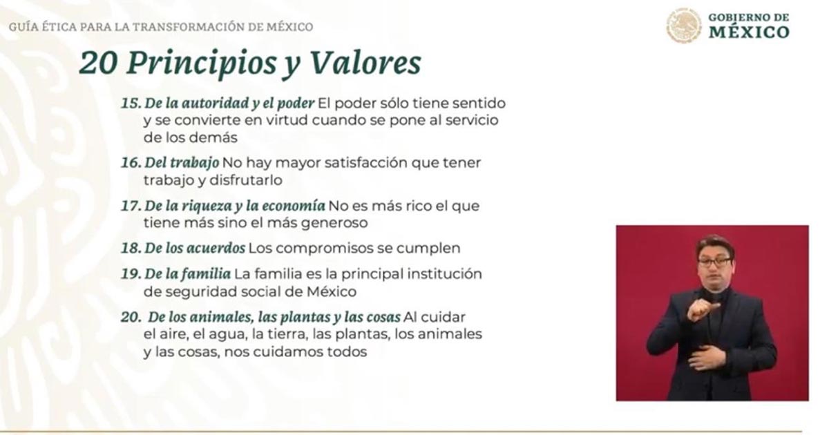 El documento sustituye a la constitución moral –el compromiso 99 de López Obrador al asumir la presidencia– y recoge algunas frases del mandatario, tales como “primeros los pobres”, “no mentir, no robar y no traicionar” y “el poder solo tiene sentido y se convierte en virtud cuando se pone al servicio de los demás”.
