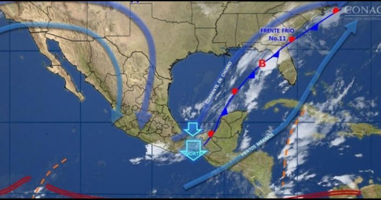 Ciudad de México.- El frente frío número 11, su masa de aire frío y una nueva onda tropical ocasionarán ambiente frío sobre entidades de la mesa del norte y la mesa central, además de evento de norte en el litoral del Golfo de México, Istmo y Golfo de Tehuantepec. De acuerdo con el Servicio Meteorológico … Sigue leyendo Prevén lluvias para toda la semana