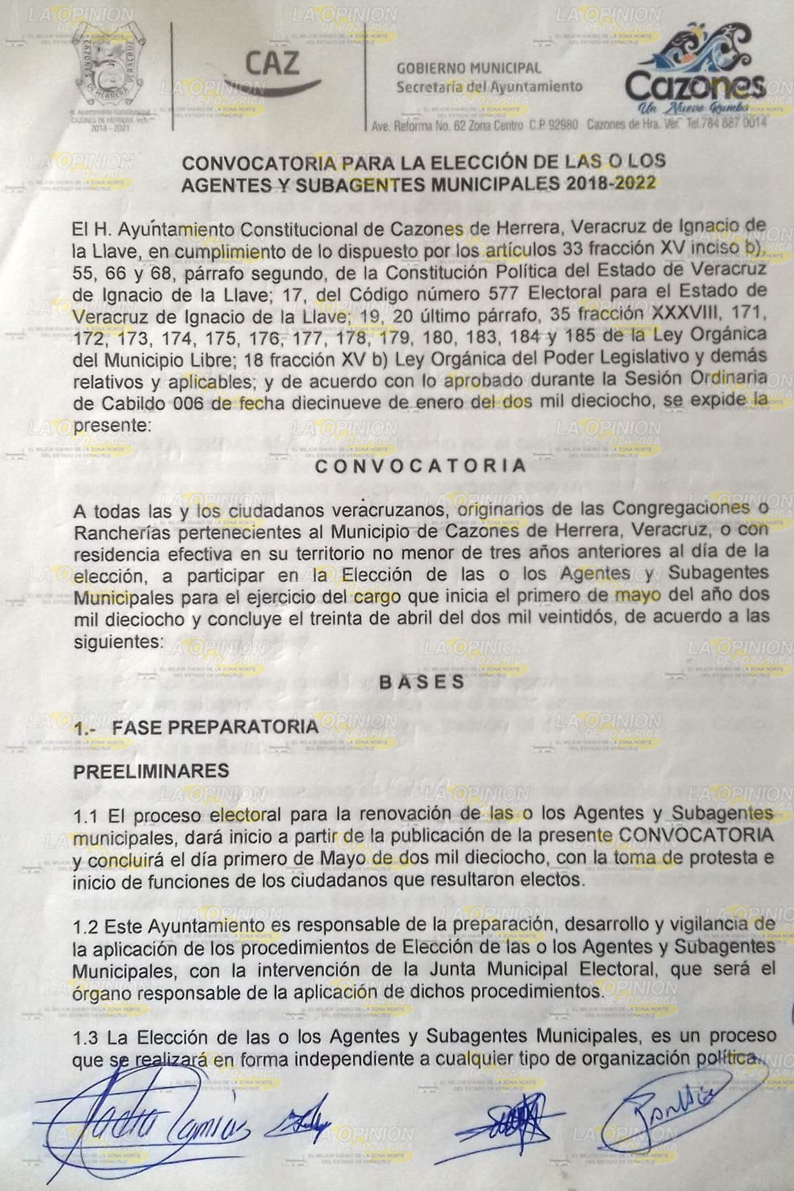 Cazones de Herrera, Ver.- Este lunes fue emitida la convocatoria para el registro de candidatos a agentes y subagentes municipales de las 37 comunidades que conforman el municipio.
