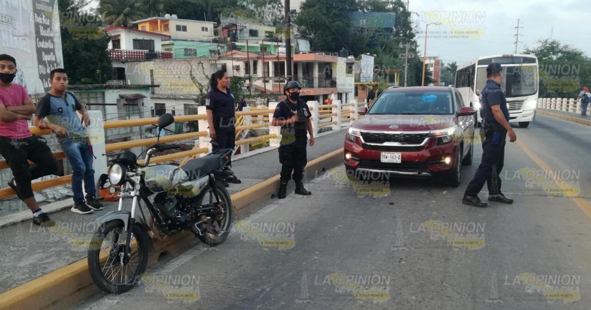 Tuxpan, Ver.- Motociclista que habría intentado hacer un rebase en el puente Tuxpan provocó un aparatoso choque dejando como únicamente cuantiosos daños materiales; fue personal de la Guardia Nacional quien tomó conocimiento del percance y aseguró las unidades y a los participantes.