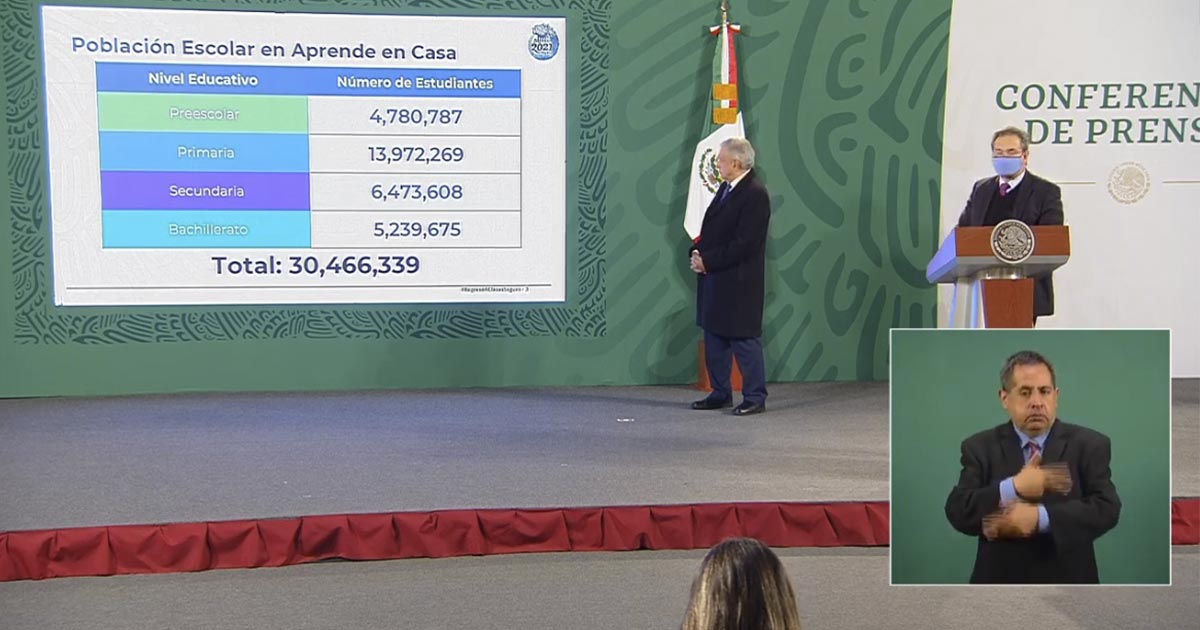 En total se prevé el regreso a clases, de manera virtual, de 25 millones 253 mil 306 alumnos y un millón 225 mil 341 maestros de educación básica; así como de 5.4 millones de alumnos y casi 400 mil profesores del nivel medio superior, donde también será bajo sistemas de educación a distancia.