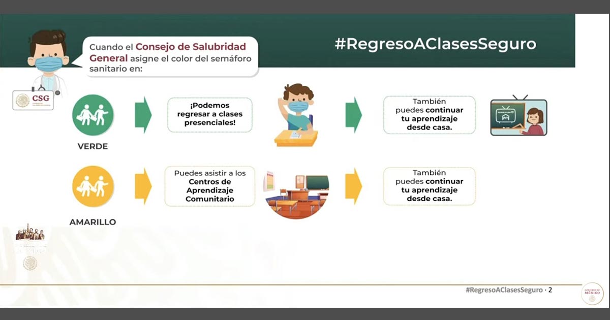 Durante la conferencia de prensa presidencial de este lunes, el aún secretario de Educación Esteban Moctezuma Barragán precisó los únicos estados en color verde son Campeche y Chiapas por lo que pueden optar por clases presenciales, los estados en amarillo pueden abrir los Centros de Aprendizaje Comunitario.