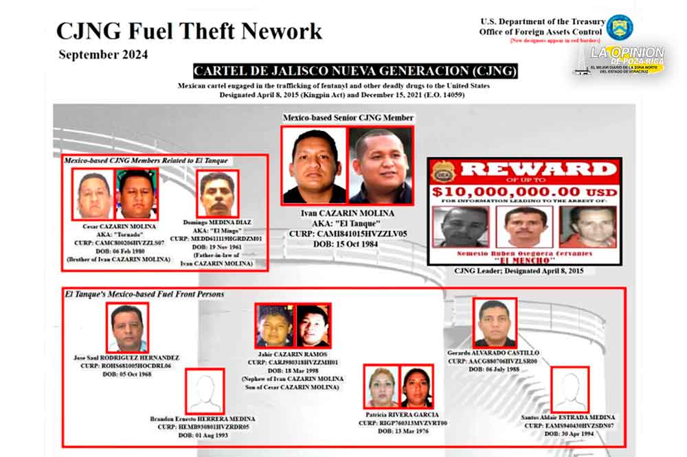 De los individuos señalados, 7 son originarios de Veracruz y estarían relacionados con el robo y reventa de combustible por órdenes del CJNG, cártel del crimen organizado que tendría presencia en el estado, y el dinero se usaría para financiar el tráfico de drogas y otras actividades del cartel, de acuerdo con informes de Estados Unidos.
