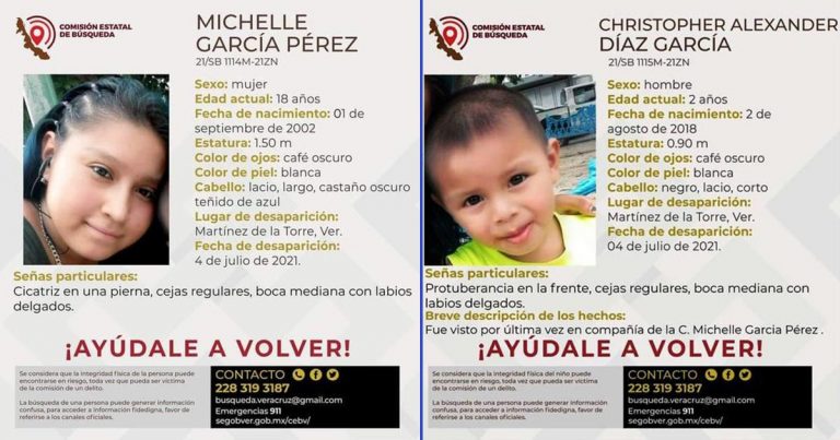 Martínez de la Torre, Ver-.- La Comisión Estatal de Búsqueda lleva a cabo la publicación de la señora Michelle García Pérez de 18 años y de su bebe Christopher de tan solo dos años de edad, los cuales están siendo reportados como desaparecidos en esta ciudad insegura. De acuerdo al reporte que están emitiendo los … Sigue leyendo Reportan desaparición de una madre con su bebe