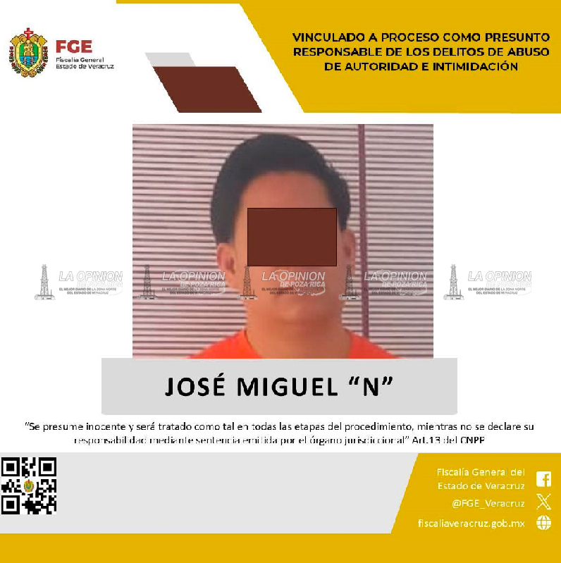 Papantla, Ver.- La Fiscalía General del Estado, en coordinación con la Fiscalía Especializada en Combate a la Corrupción, logró que un juez dictara prisión preventiva oficiosa en contra de José Miguel “N”, exdirector de la Policía Municipal de Papantla, tras ser vinculado a proceso por su presunta participación en los delitos de abuso de autoridad e intimidación.