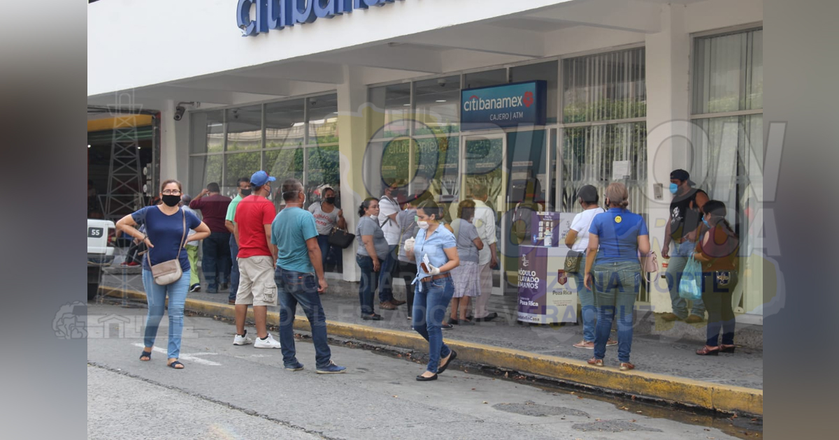 Poza Rica.- En medio del viernes de quincena y con el centro de la ciudad cerrado los bancos aun así están repletos de usuarios quienes acuden a realizar sus trámites, principalmente maestros.