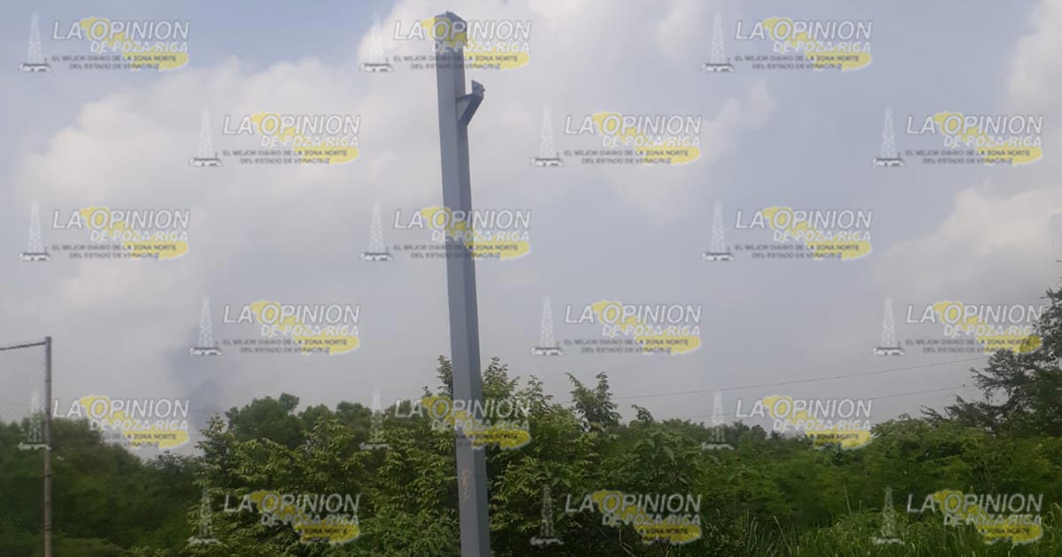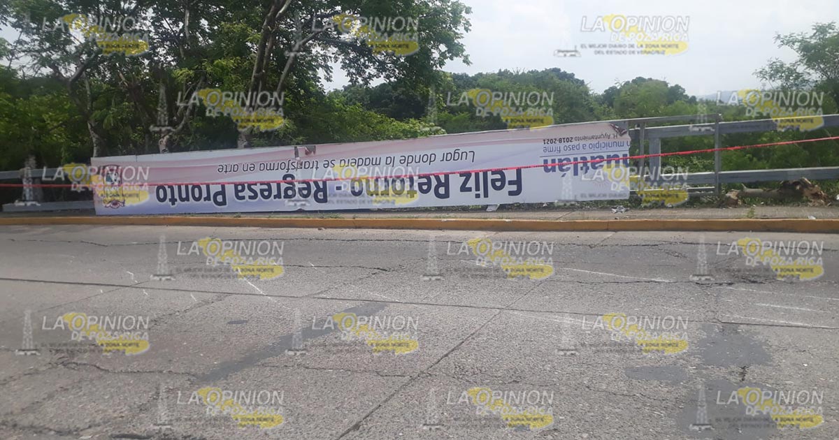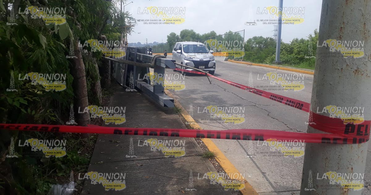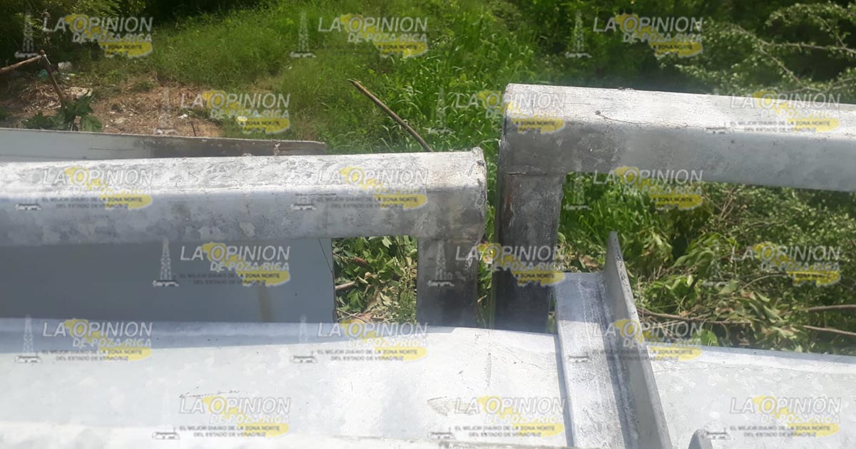 Tihuatlán, Ver.- Peligrosamente cayó esta mañana de sábado la estructura metálica del anuncio «Bienvenidos a Tihuatlán» que se ubicaba en el Puente Cazones 2 que une a este municipio con Poza Rica, afortunadamente no se registraron personas lesionadas durante el suceso que causó alarma entre automovilistas que pasaron minutos después por el sitio.