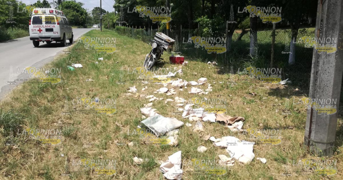 Tuxpan, Ver.- Repartidor de masa y tortilla que manejaba una motocicleta sobre la carretera que conduce a la congregación de Cobos, de esta localidad sufrió un aparatoso accidente al enredarse con cableado eléctrico que un tráiler minutos antes había derribado provocándose diversas contusiones en el cuerpo.