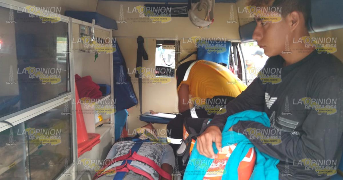 Tihuatlán, Ver.- Dos jóvenes resultaron lesionados uno más que el otro al estrellar la motoneta en la que viajaban contra la parte trasera de una camioneta que ingresaba a una gasolinera, ambos terminaron sobre el pavimento.
