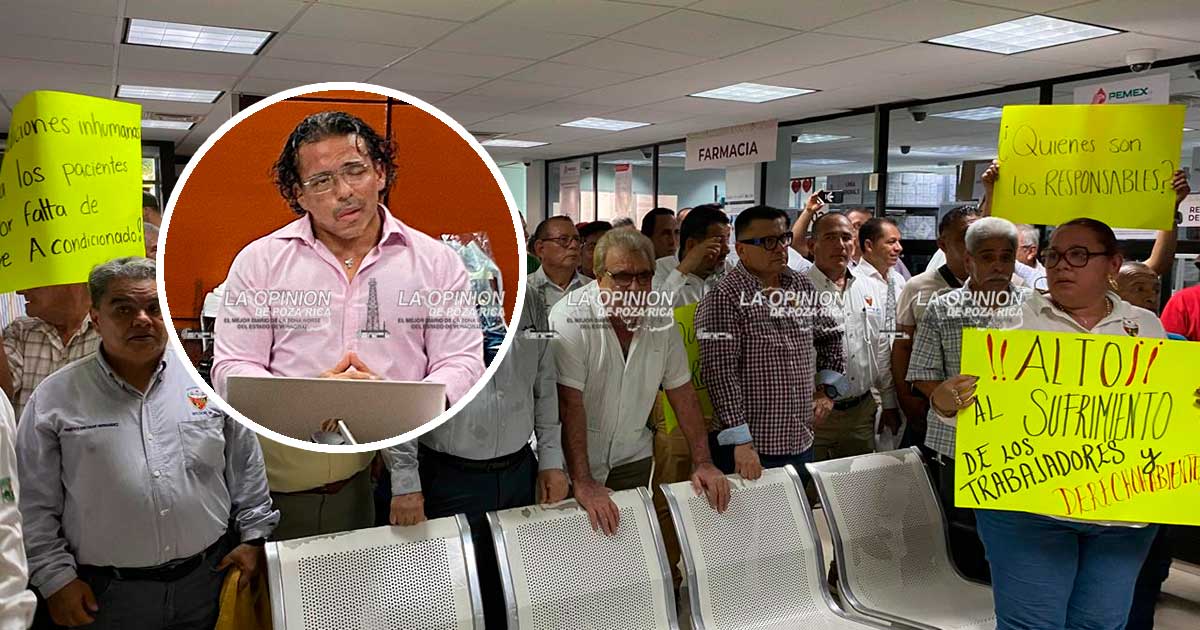 Poza Rica, Ver.- Hartos de malos tratos, falta de médicos especialistas, cancelación de diálisis, hemodiálisis, falta de medicamentos, y para colmo tener a los pacientes día y noche sin clima en plena ola de calor, derivó en que trabajadores de todas las áreas, así como los jubilados, se manifestaran en las calles de la ciudad, a tal grado de ingresar al Hospital Regional de PEMEX, donde encararon al director Emmanuel Román Cerón Montiel.