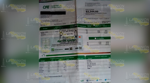 Son varios los tantoyuquenses que se han quejado de los cobros excesivos por parte de CFE, por lo que no solo algunos habitantes de la colonia Centro, sino también de la colonia del Valle, entre otros, han señalado que en este recibo de luz, el monto se elevó no solo al doble, sino al triple.