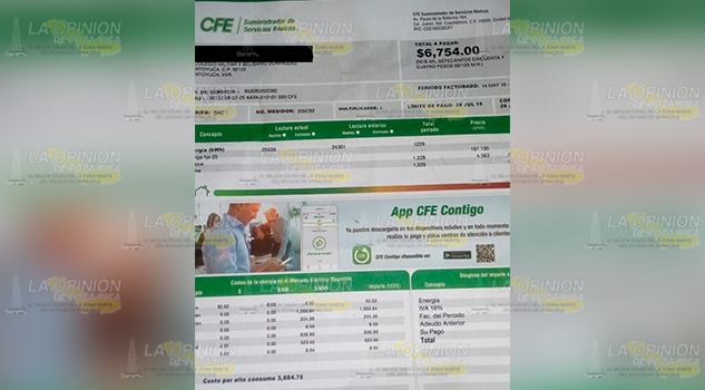 Es el caso de un vecino de la colonia Centro, quien dio a conocer el excesivo cobro que está haciendo la empresa de Clase Mundial, el costo del recibo de luz anterior fue de 2,344 pesos, mientras el último recibo llegó con un monto a pagar de 6,754 pesos.
