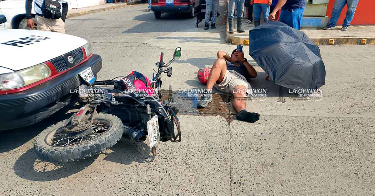 Cazones de Herrera, Ver.- Un motociclista resultó lesionado luego de ser derribado por un taxi de Poza Rica cuando circulaba por calles de este municipio; dicho motociclista es un elemento activo de la Marina.