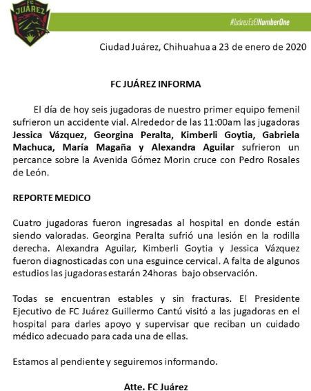 «Cuatro jugadoras fueron ingresadas al hospital en donde están siendo valoradas. Georgina Peralta sufrió una lesión en la rodilla derecha. Alexandra Aguilar, Kimberli Goytia y Jessica Vázquez fueron diagnosticadas con una esguince cervical», recalcó el club.