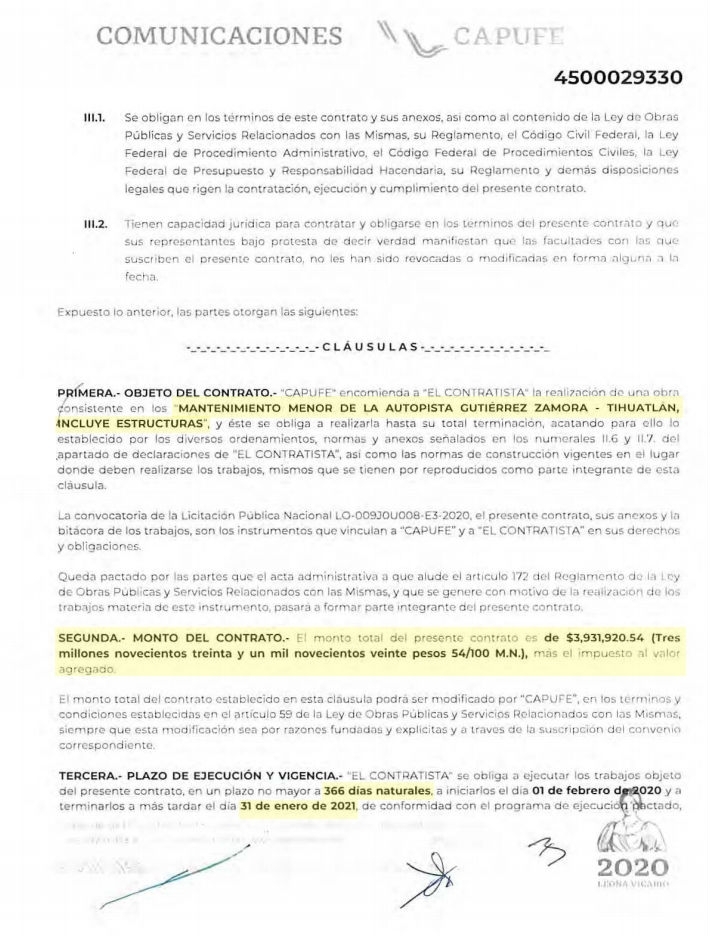 De acuerdo con copias de los contratos alojadas en la Plataforma Nacional de Transparencia, los trabajos de mantenimiento los pagará el Fondo Nacional de Infraestructura (Fondin) y la ejecutante de la obra es «Obras Civiles y Electromecánicas Márquez S.A. de C.V.», beneficiada con un contrato por 3 millones 931 mil 927 pesos, sin incluir IVA.