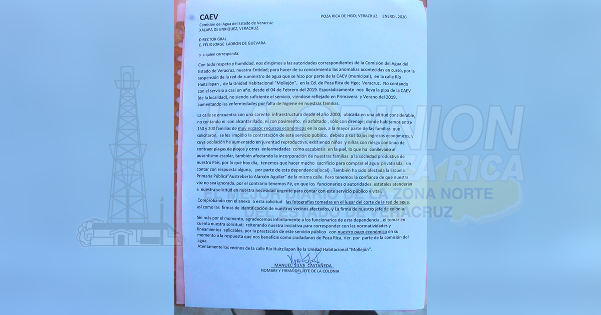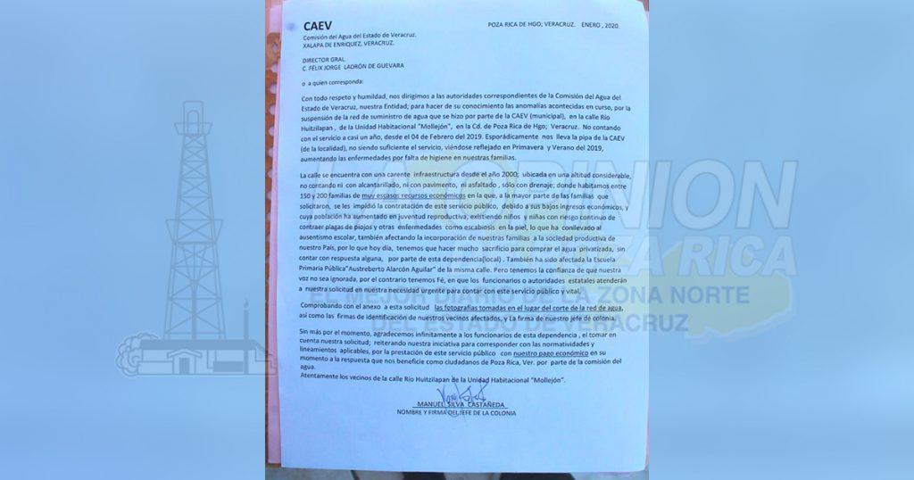 Asimismo hacen un llamado al director general de la CAEV, Félix Jorge Ladrón de Guevara, para que tome cartas en el asunto, antes de acudir al ayuntamiento estuvieron en las instalaciones de la oficina operadora de agua potable de Poza Rica.