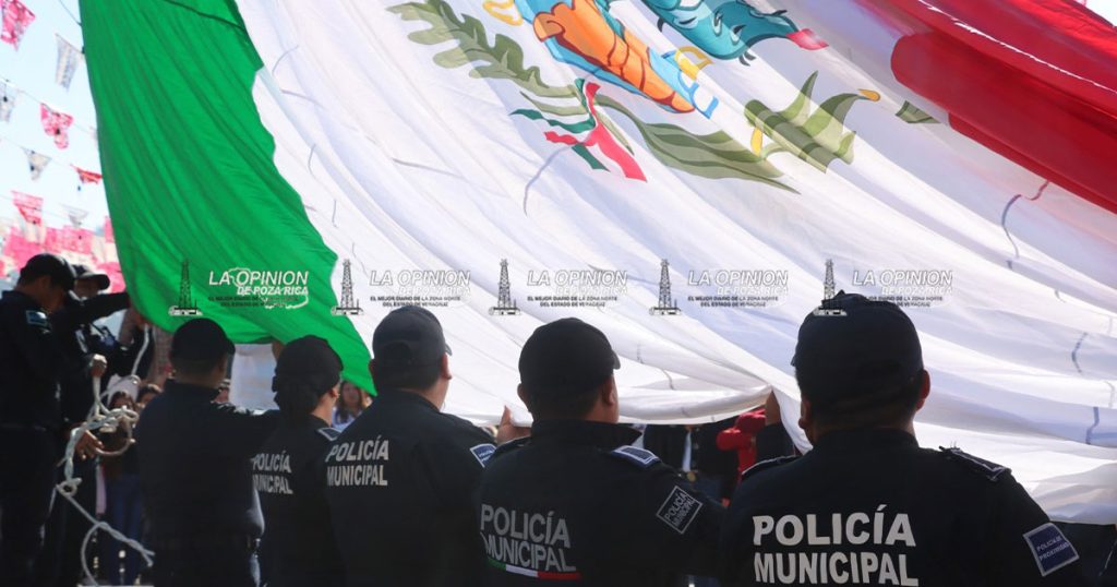 Elementos de la Policía Municipal, que integraron la escolta oficial, entregaron una bandera monumental para su izamiento al alcalde Leobardo Gómez González, quien estuvo acompañado por la titular del DIF, Patricia Ortiz de Gómez, la directora del mismo, Yunis Gómez Ortiz, así como ediles.