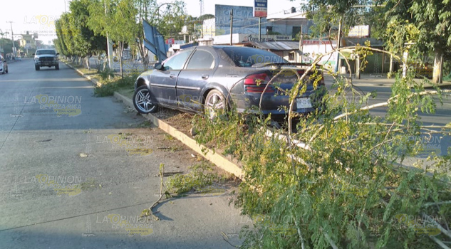 Ebrio conductor, pierde el control del volante y trepa su automóvil al camellón central del bulevar independencia de la colonia Plan de Ayala, Tihuatlán.