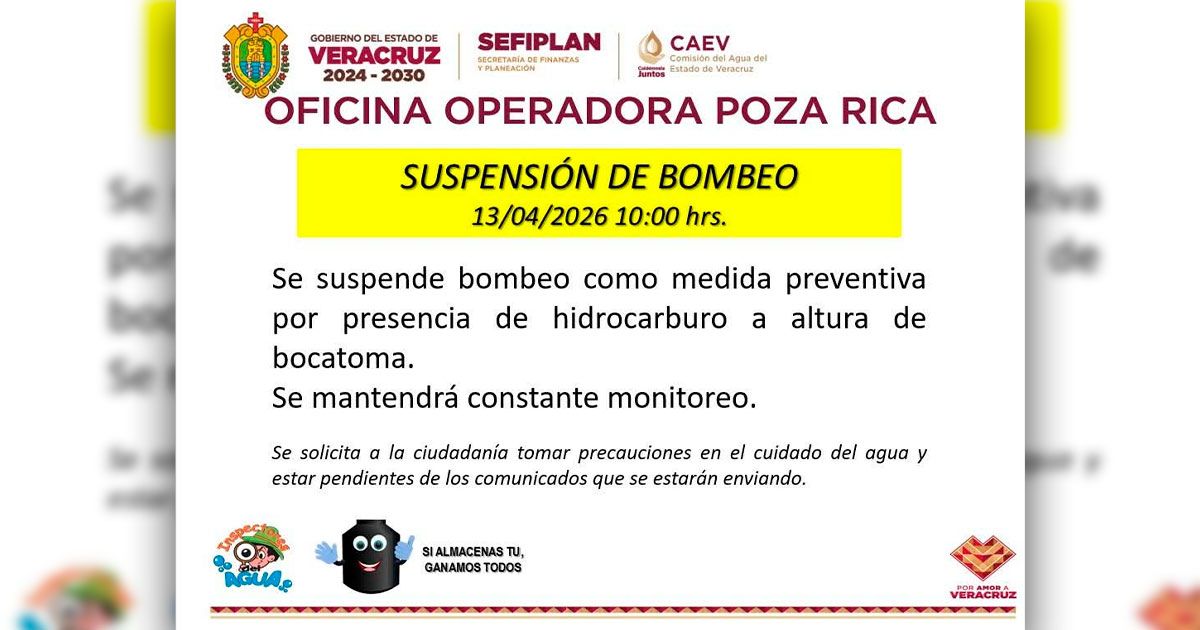 POZA RICA, VER. — La Oficina Operadora de la Comisión del Agua del Estado de Veracruz (CAEV) en Poza Rica anunció la suspensión del servicio de bombeo de agua potable a partir de las 10:00 horas de este lunes 13 de abril, tras detectar la presencia de hidrocarburo en las inmediaciones de la bocatoma.